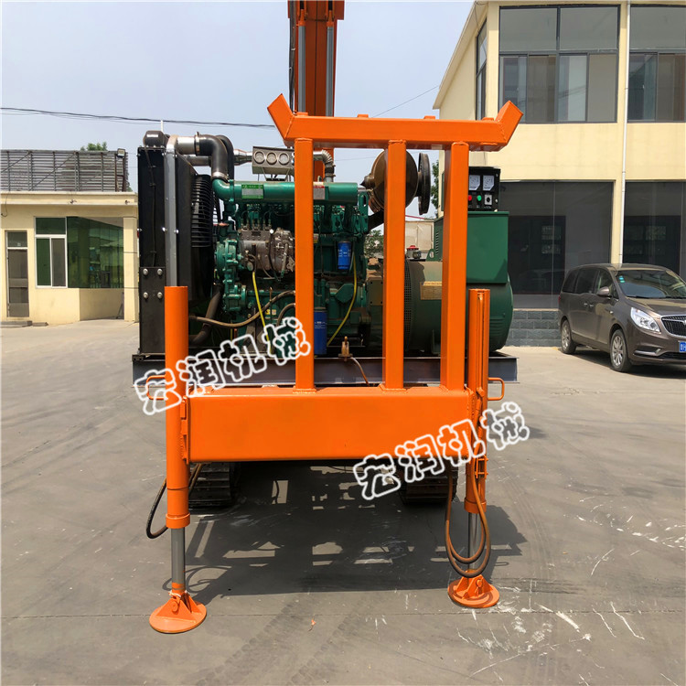該機包括液壓樁架和鉆進系統兩部分。樁架采用液壓步履式底盤,自動化程度高,可自行行走及360度回轉,設有四條液壓支腿及一條行走油缸以輔助行走及回轉同時增加施工時的整機穩定性,可整機進行轉運。