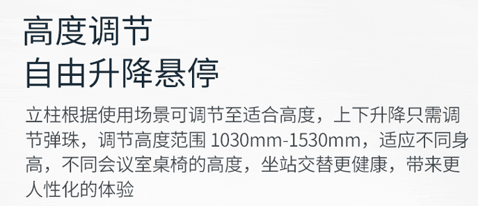 高度調節,自由升降懸停。 立柱根據適用場景可調節至合適高度,上下升降只需要調節彈珠,調節范圍1390mm-1740mm,適應不同身高,不同會議室桌椅的角度,坐站交替更健康,帶來更人性化的體驗