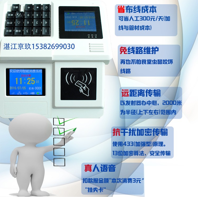 本網頁所展示的有關 湛江市霞山區京玖辦公設備經營部 為你提供的“湛江員工食堂消費機售飯機刷卡機”一卡通管理系統價格、型號、圖片、廠家等信息。如有需要請撥打電話:15382699030。