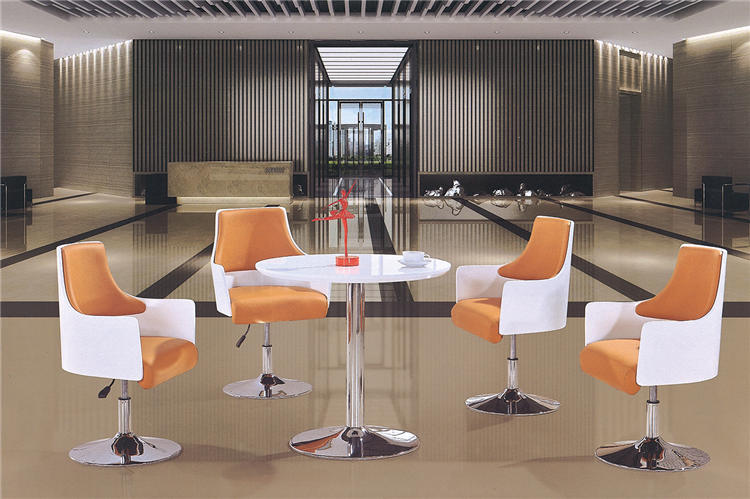椅:1.5CM厚經高溫處理,帖木皮烤漆壓縮成型彎曲木板,西皮飾面,全新45密度高回彈海棉,45CM直徑電鍍喇叭盆, 椅可以升降旋轉。 桌:3CM厚高密度板貼木皮烤漆,55CM直徑電鍍五金喇叭盤。