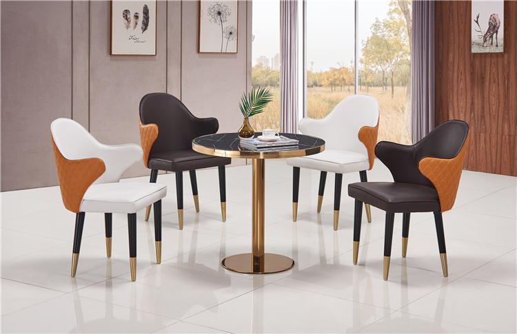椅:西皮飾面,實木彎板,全新45密度高回彈海棉,白蠟木腳,不銹鋼鍍金腳套。