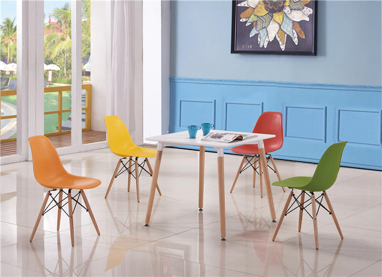 椅:全新PP塑料坐架,橡木實木腳,五金連接件。桌:中纖板烤漆桌面,櫸木腳