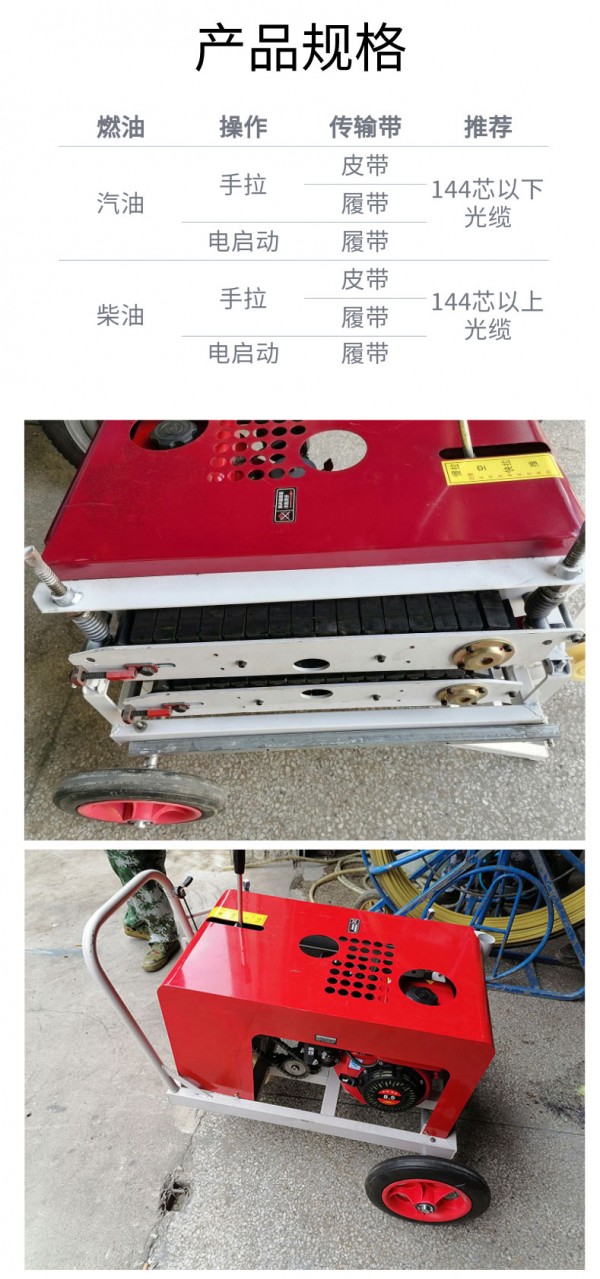 1,光纜牽引機(jī)本機(jī)器主要由發(fā)動(dòng)機(jī),變數(shù)箱,傳送裝置三大部分組成,傳送裝置的鉗口采用上下開(kāi)合讓位,使光纜收放自如。牽引機(jī)用汽油發(fā)動(dòng)機(jī)為動(dòng)力源,經(jīng)變數(shù)箱帶動(dòng)主軸此輪鏈條,鏈條咬合傳送皮帶, 實(shí)現(xiàn)直線運(yùn)動(dòng),本機(jī)還加裝支撐桿來(lái)支撐機(jī)器運(yùn)行中光纜的反作用力,保持傳送光纜時(shí)機(jī)器不動(dòng)。