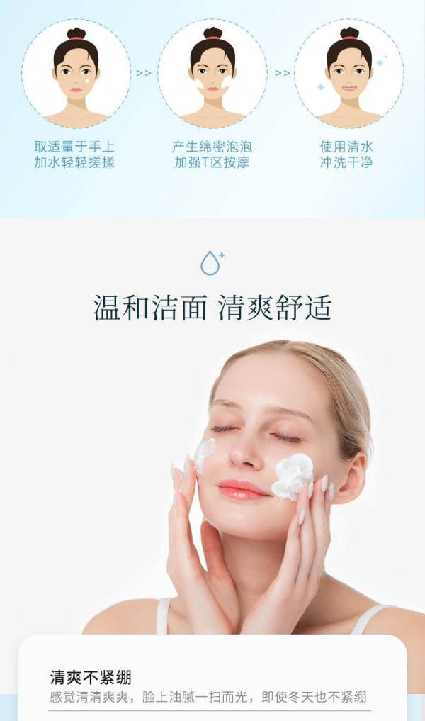 使用方法:*步取適量于掌心,加入清水進(jìn)行揉搓出泡,第二步均勻涂抹面部按摩,停留30s左右,第三部用溫水洗凈
