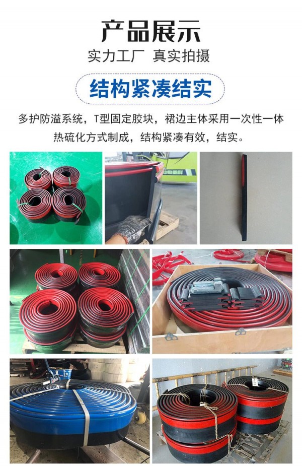 5.多護防溢系統,T型固定膠塊,皮帶機防溢裙板裙邊主體采用一次性一體熱硫化方式制成,結構緊湊有效,結實耐用。背面的T型固定膠塊可根據客戶要求在制作的過程中去掉,以適應過去老的安裝方法。山東美奐