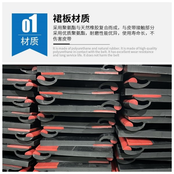 雙層防護防溢裙板,導料槽密封系統,Y型固定膠塊,裙邊主體采用一次性一體熱硫化方式制成,結構緊湊有效,結實。背面的型固定膠塊可根據客戶要求在制作的過程中去掉,以適應過去老的安裝。