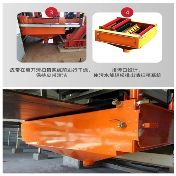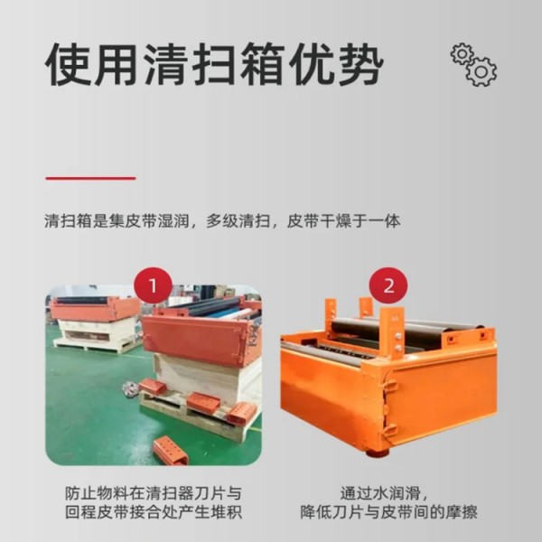 2、噴淋系統:清掃箱是先通過對皮帶機輸送帶上的粘著物料進行軟化、清洗,使物料更容易進行下一道工序。